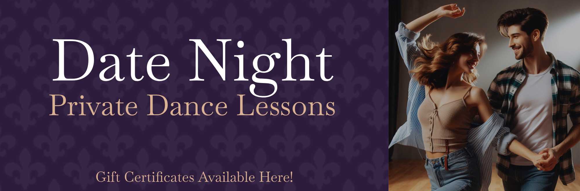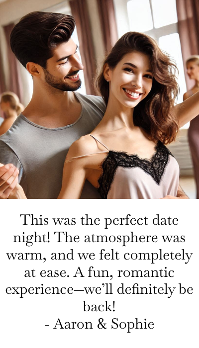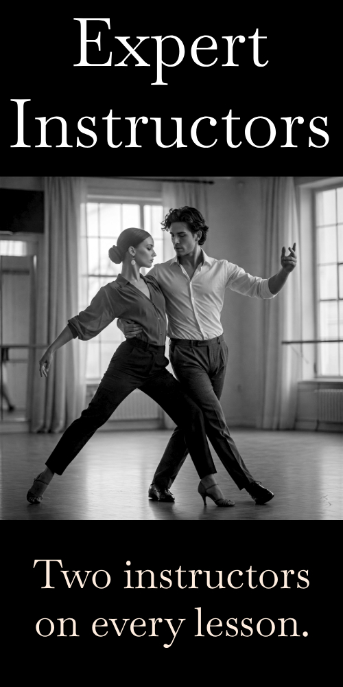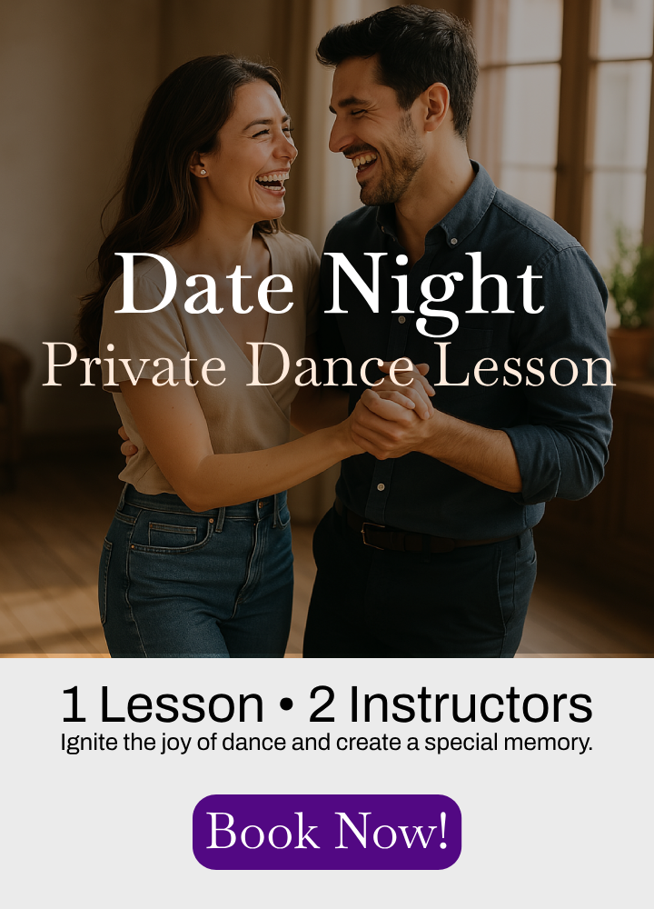Each Date Night Experience is a private lesson with two instructors guiding you. We’ll focus on your goals and your connection. (At times, another private lesson may be happening on the other side of the floor.)